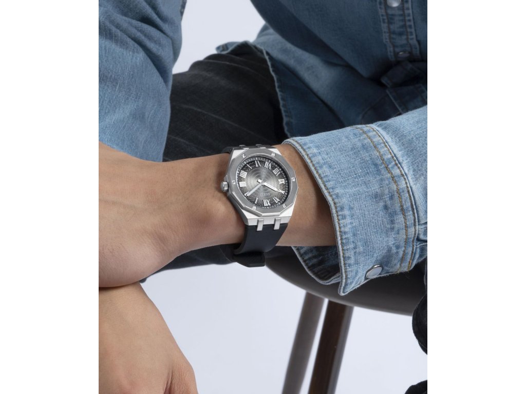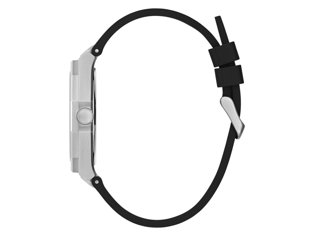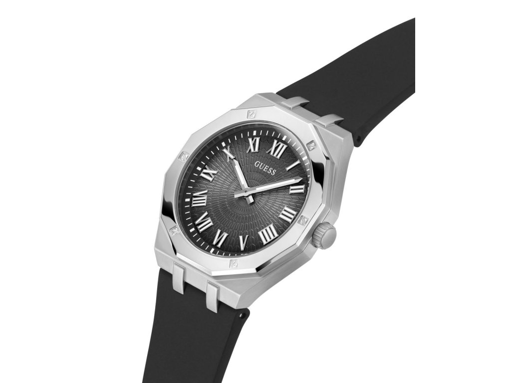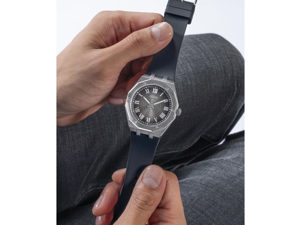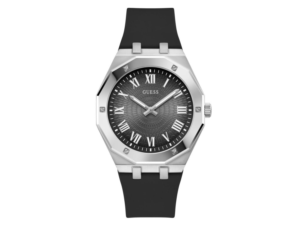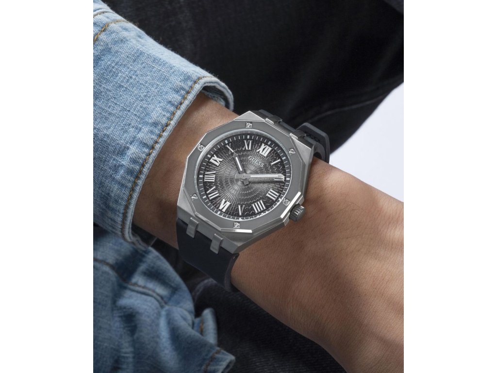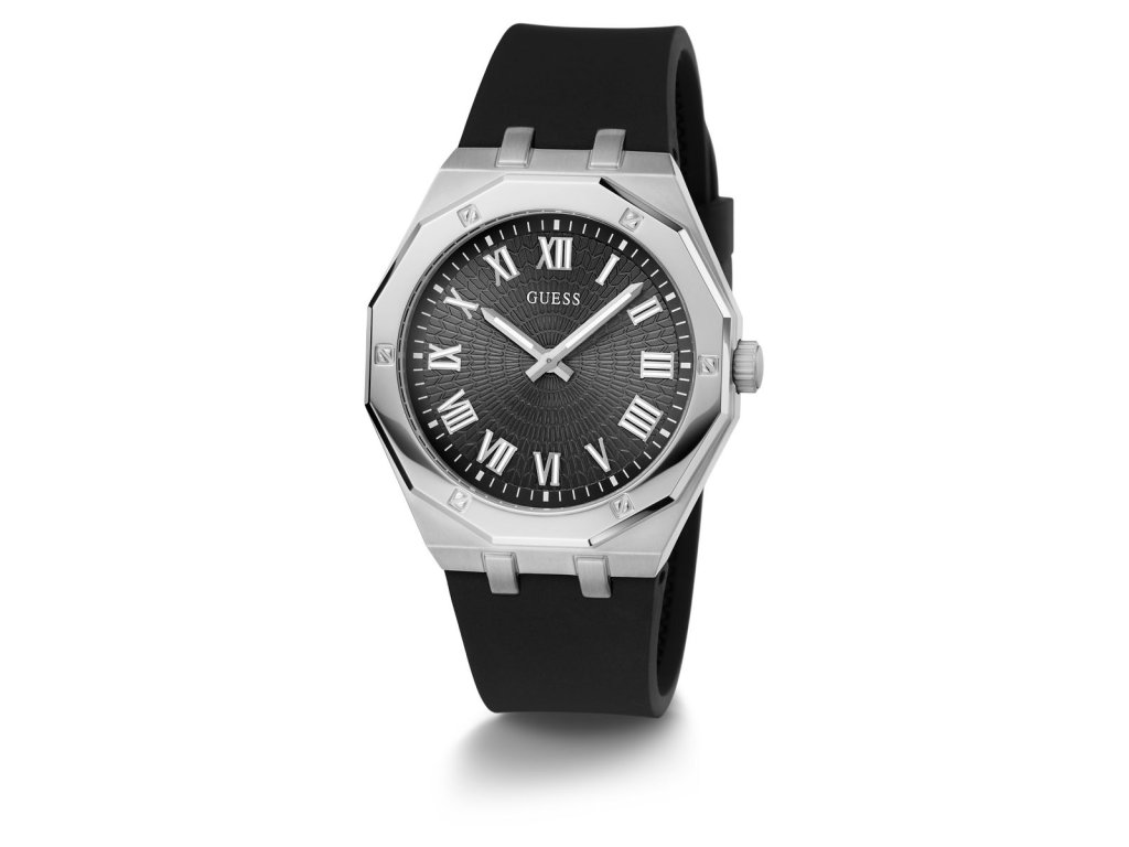 Pánske hodinky GUESS Asset z nerezovej ocele s čiernym ciferníkom a čiernym silikónovým remienkom sú dodávané v originálnej krabičke. Lesk Star je autorizovaným predajcom Guess.