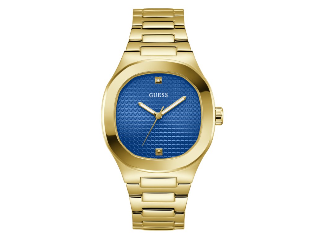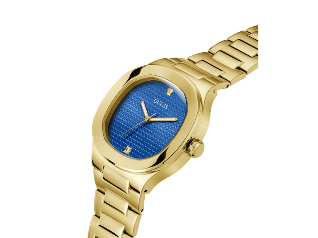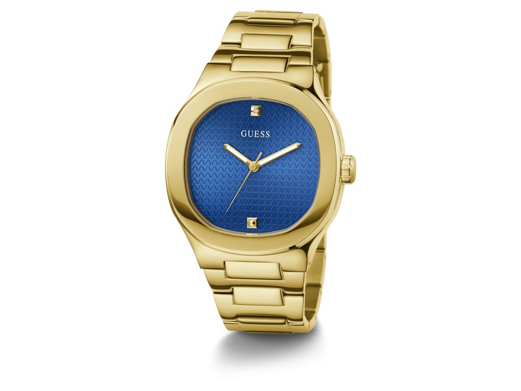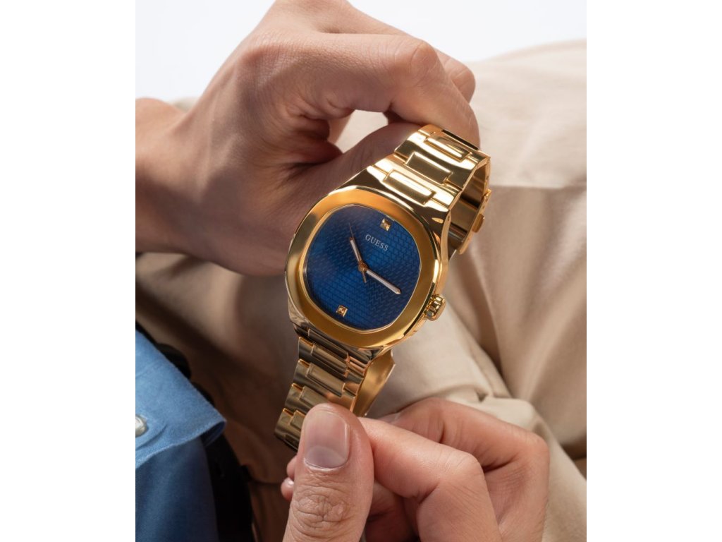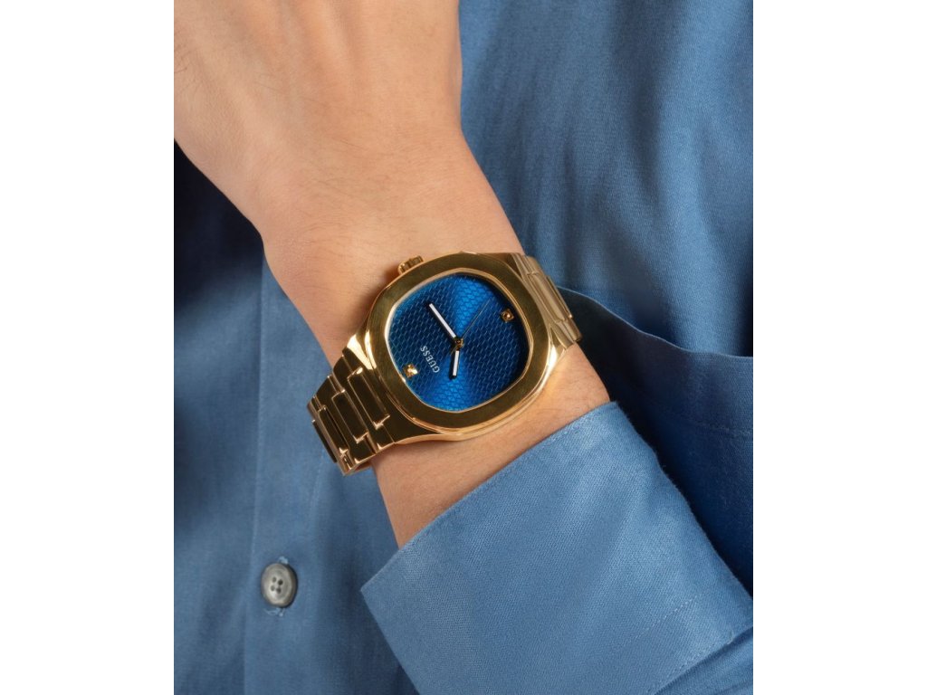 Dámske / pánske hodinky GUESS Dress z nerezovej ocele s modrým ciferníkom pozlátené žltým zlatom sú dodávané v originálnej krabičke. Lesk Star je autorizovaným predajcom Guess.