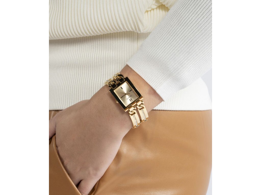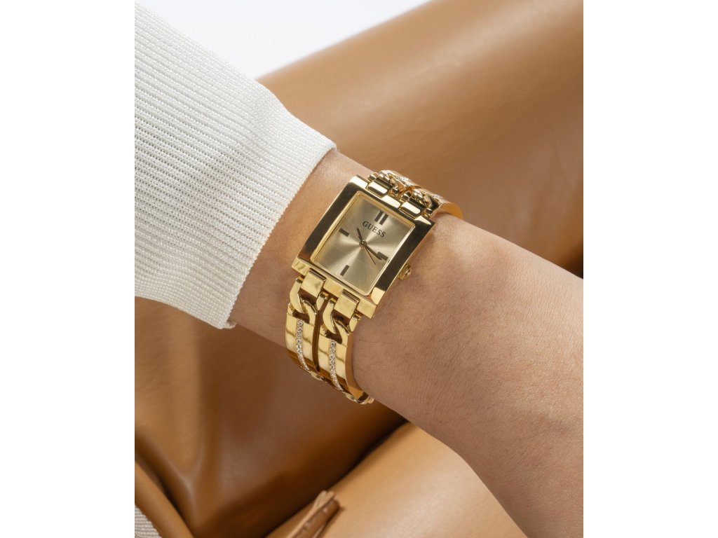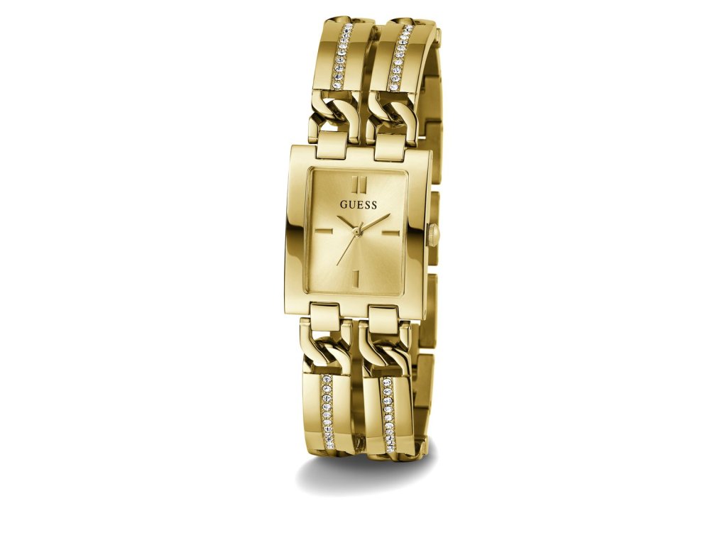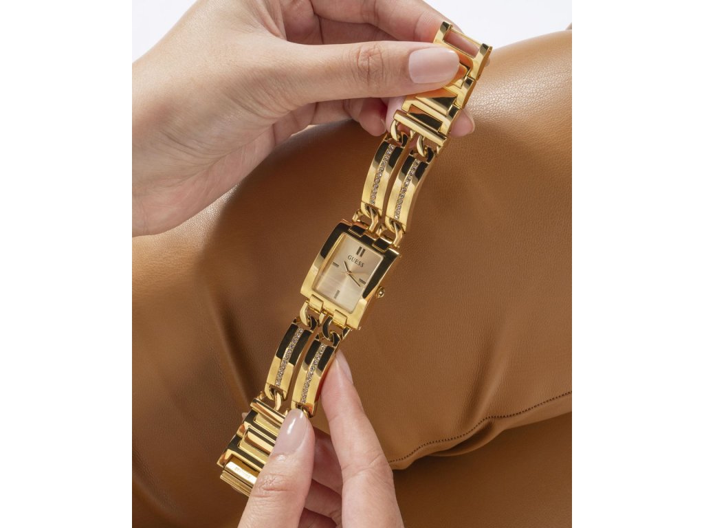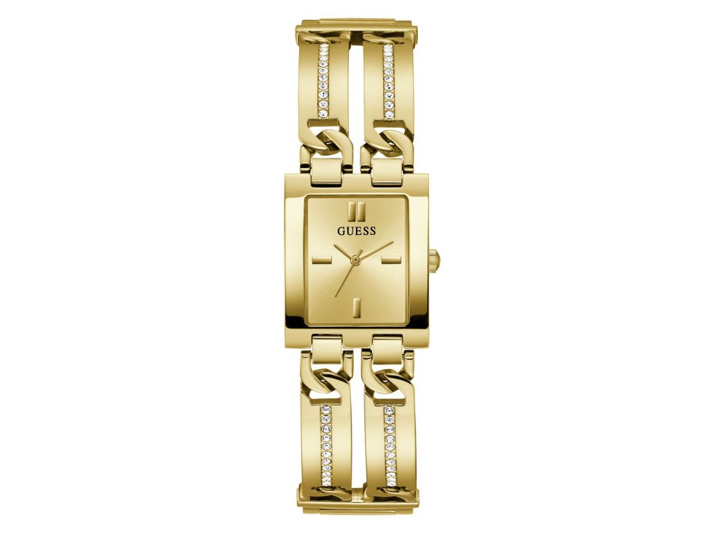 Dámske hodinky GUESS Mod ID z nerezovej ocele zlaté so zlatým ciferníkom zdobené zirkónmi sú dodávané v originálnej krabičke. Lesk Star je autorizovaným predajcom Guess.