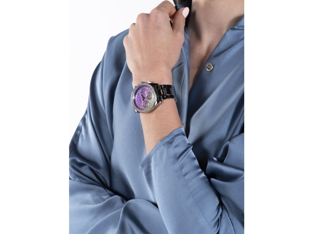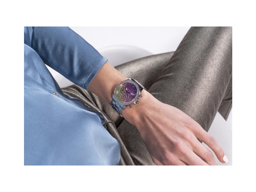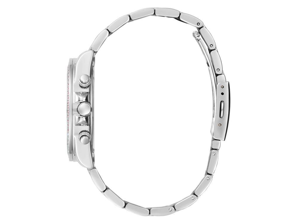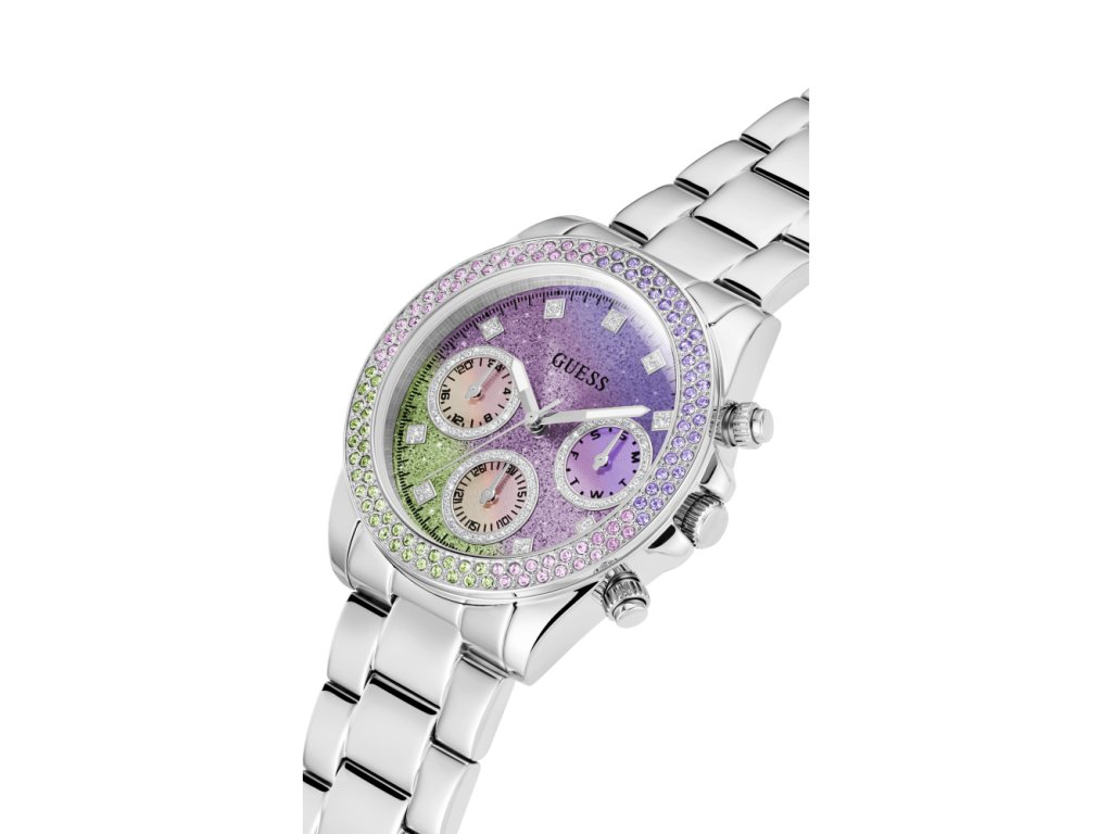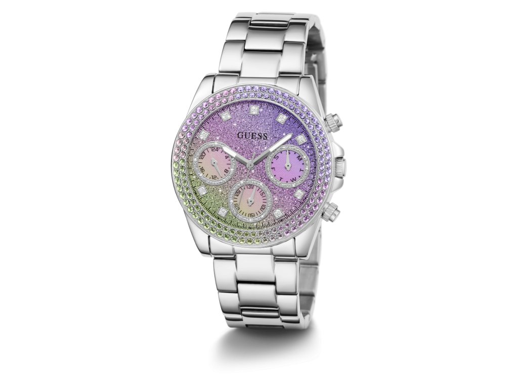 Dámske hodinky GUESS Sol z nerezovej ocele strieborné s viacfarebným trblietavým ciferníkom zdobené farebnými zirkónmi sú dodávané v originálnej krabičke. Lesk Star je autorizovaným predajcom Guess.