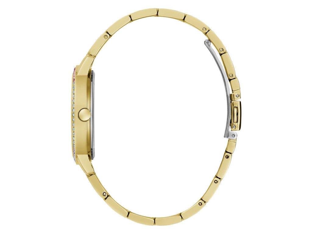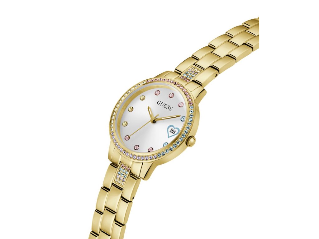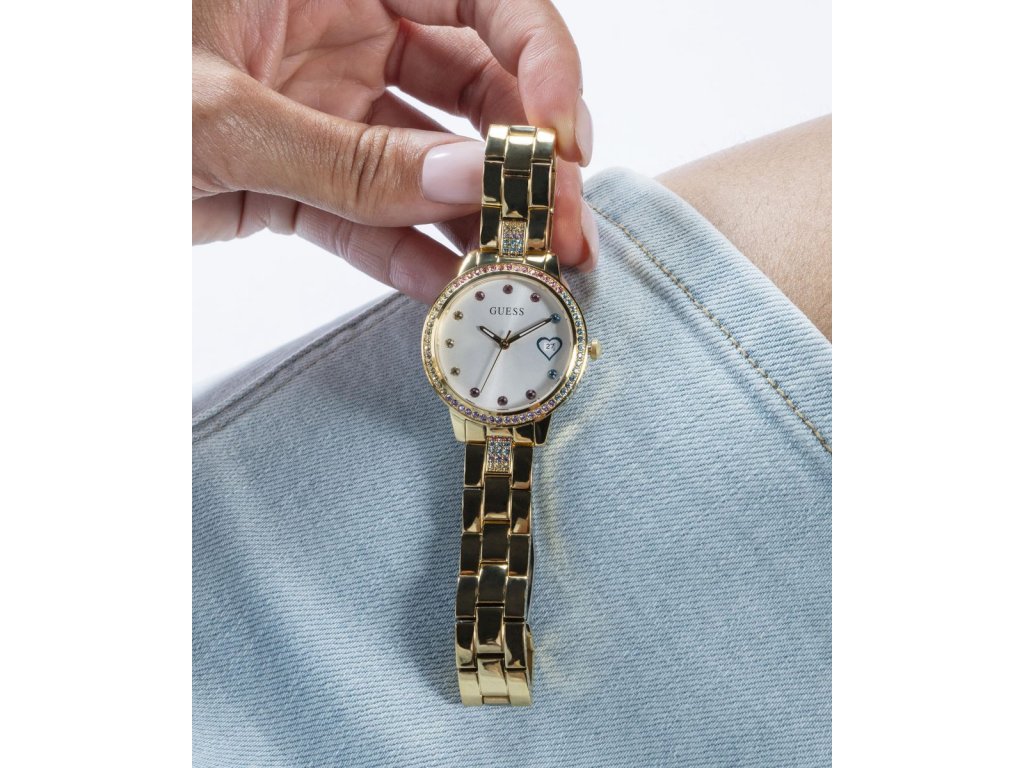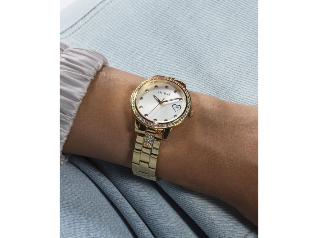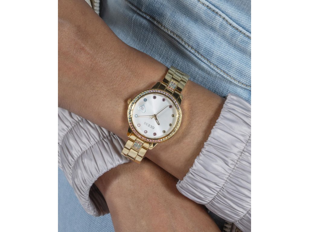 Dámske hodinky GUESS Three Of Hearts z nerezovej ocele so strieborným ciferníkom zdobené farebnými zirkónmi so srdiečkom pozlátené žltým zlatom sú dodávané v originálnej krabičke. Lesk Star je autorizovaným predajcom Guess.