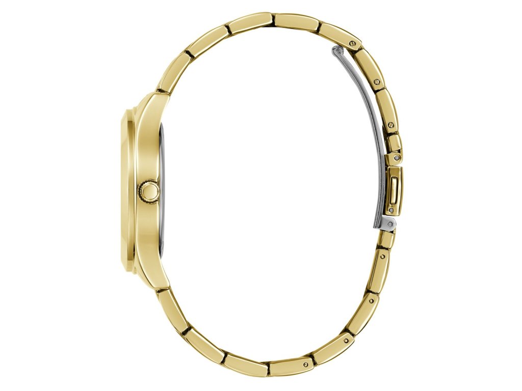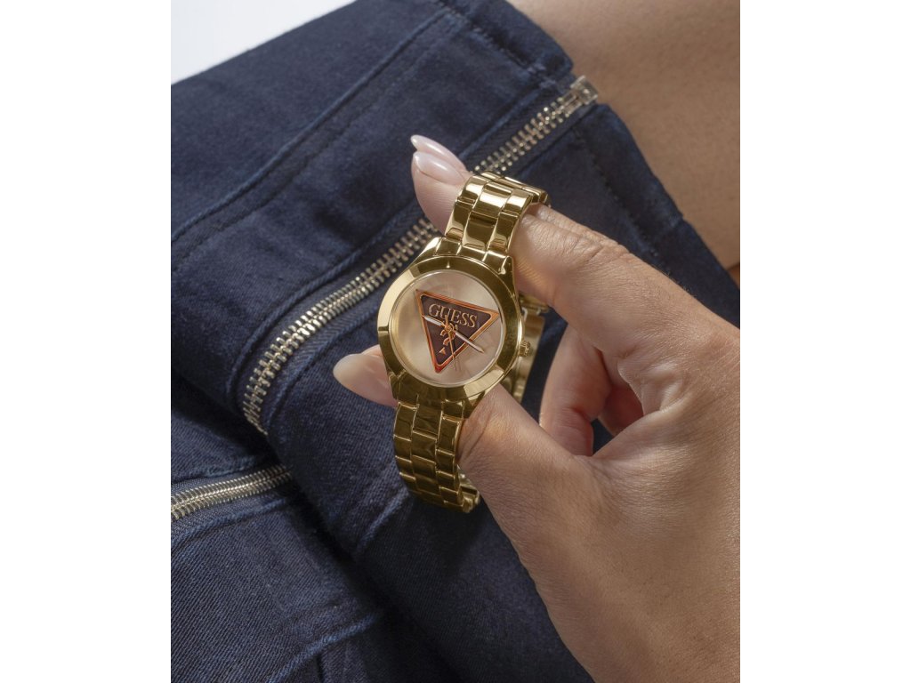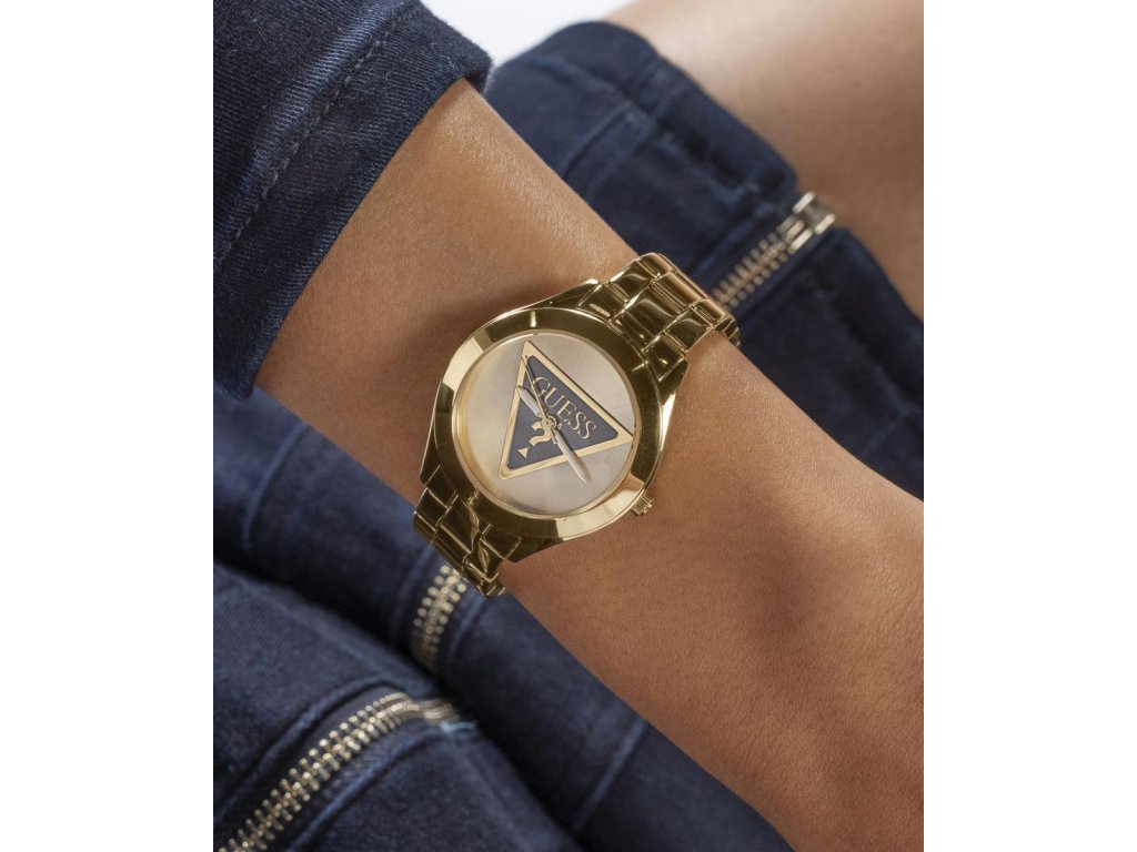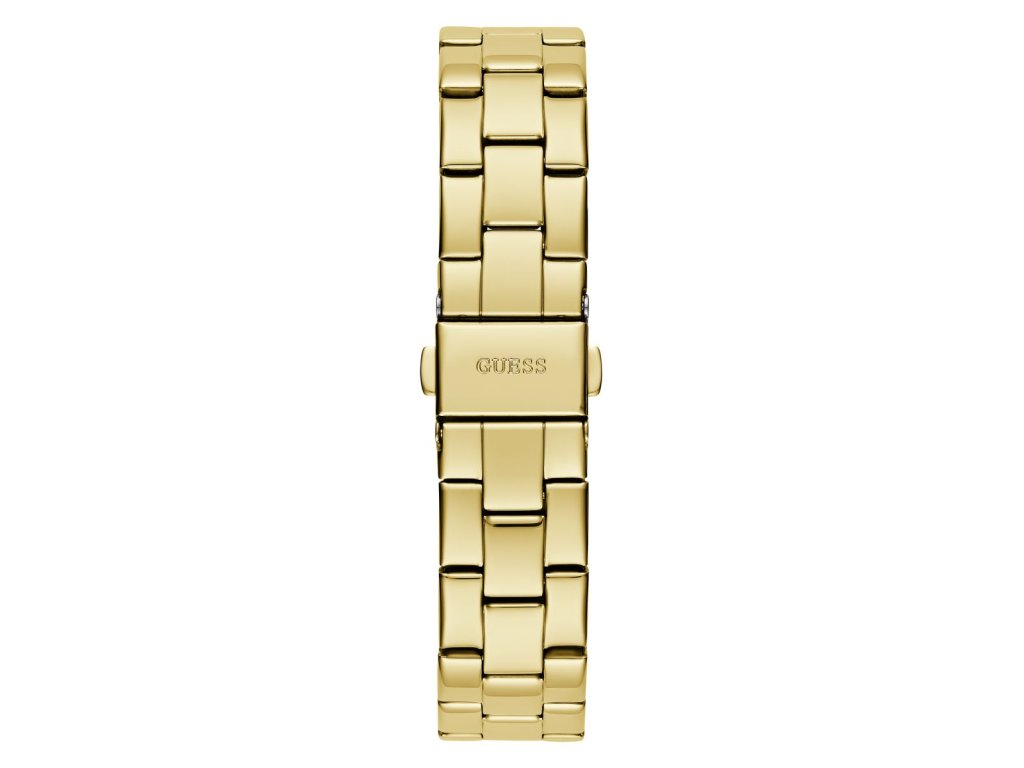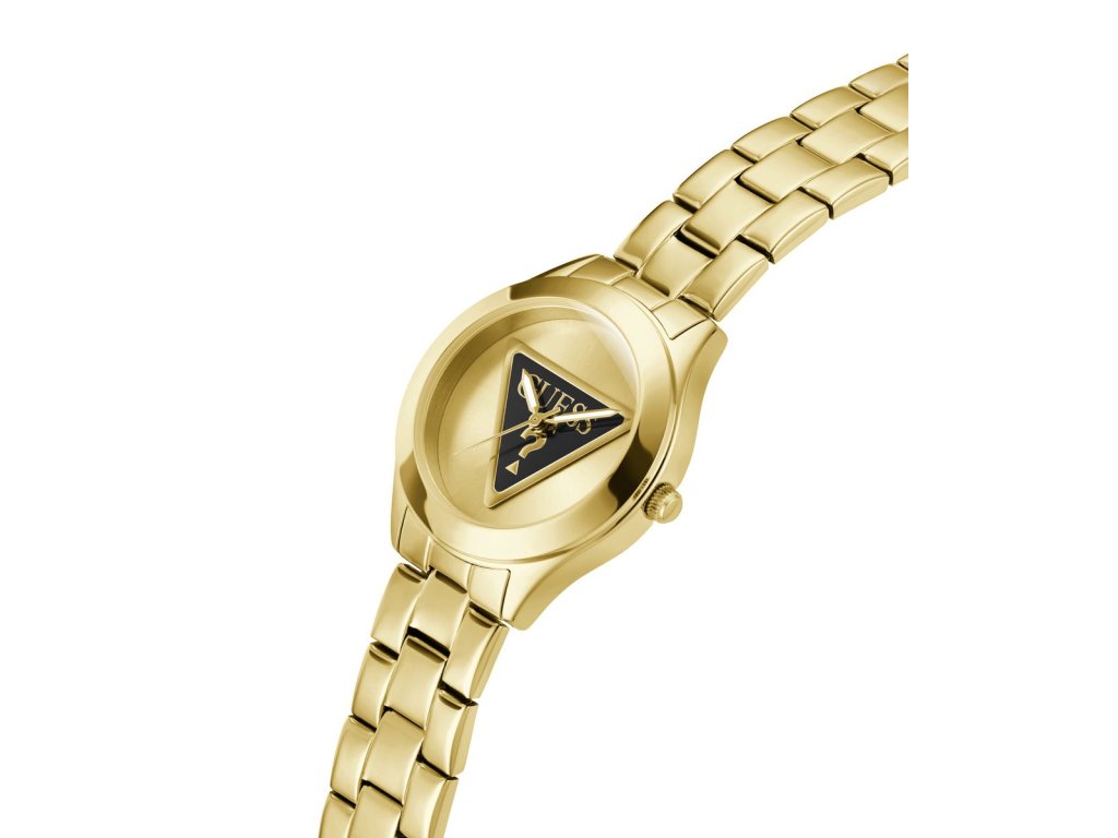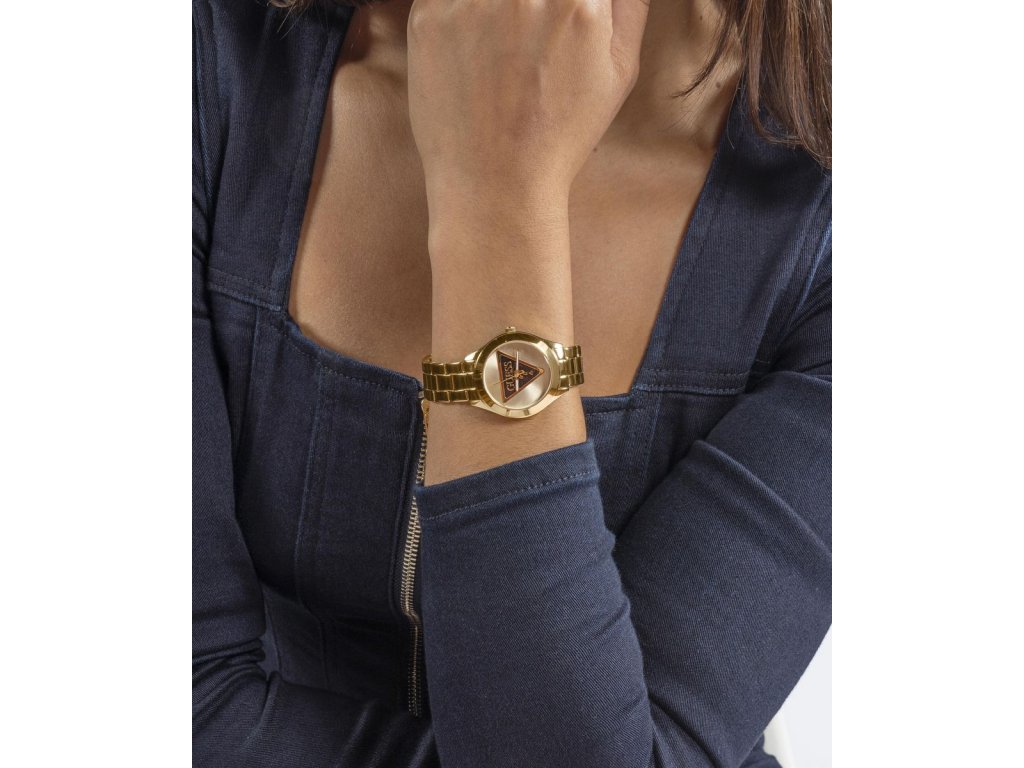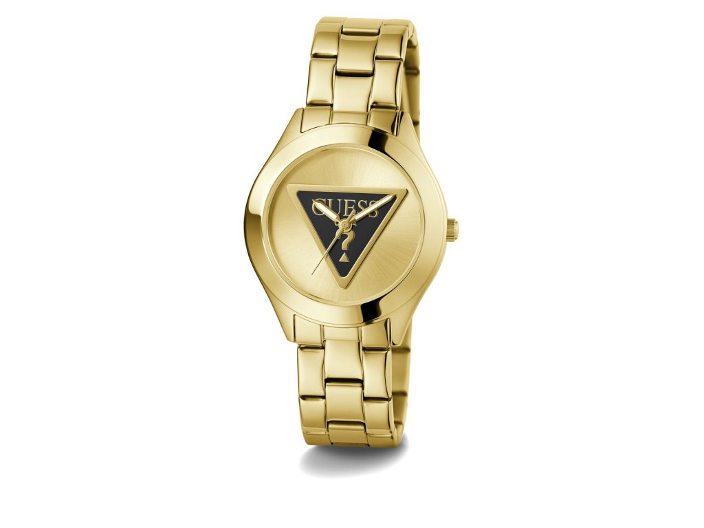 Dámske hodinky GUESS Tri Plaque z nerezovej ocele so zlatým ciferníkom a tmavým logom Guess pozlátené žltým zlatom sú dodávané v originálnej krabičke. Lesk Star je autorizovaným predajcom Guess.