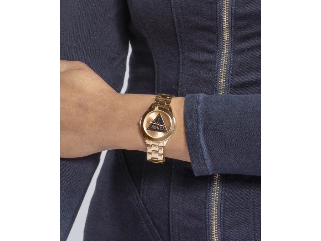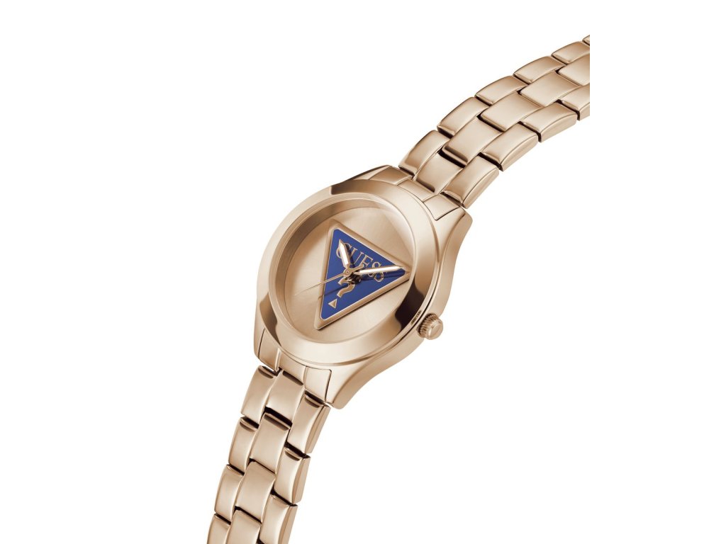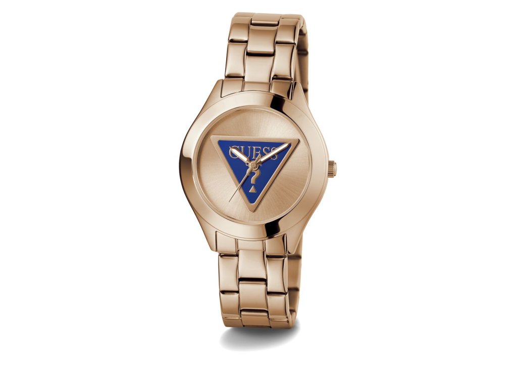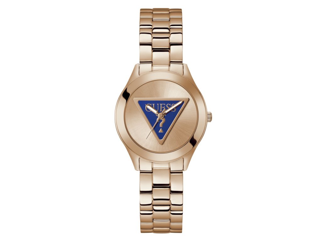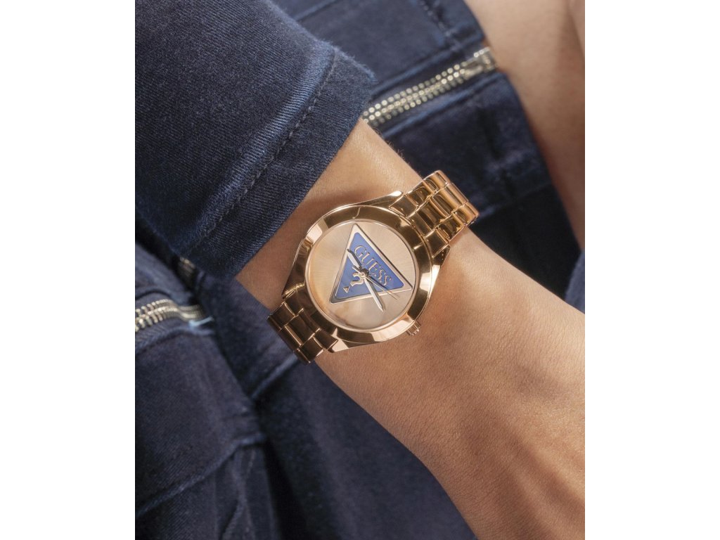 Dámske hodinky GUESS Tri Plaque z nerezovej ocele s ružovo-zlatým ciferníkom a modrým logom Guess pozlátené ružovým zlatom sú dodávané v originálnej krabičke. Lesk Star je autorizovaným predajcom Guess.