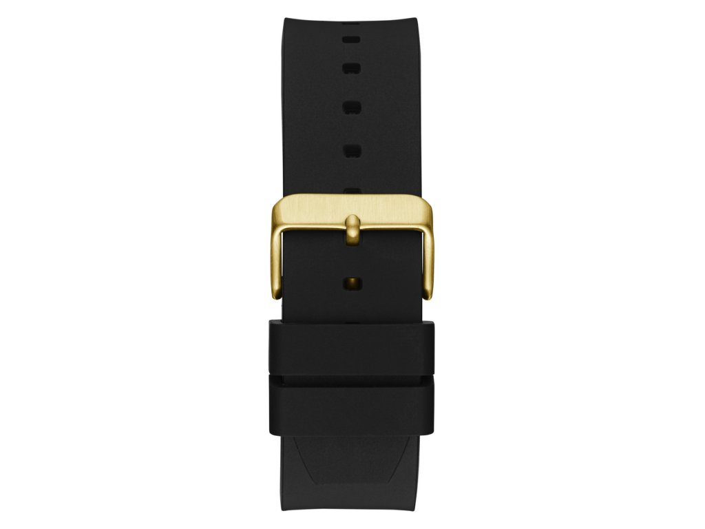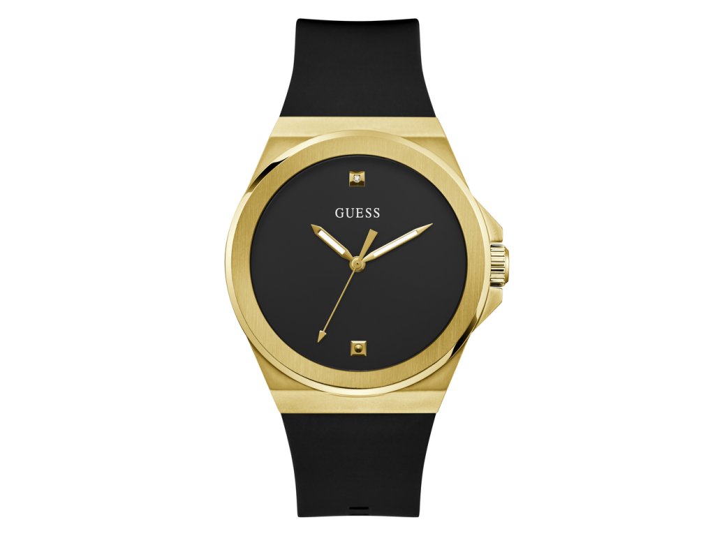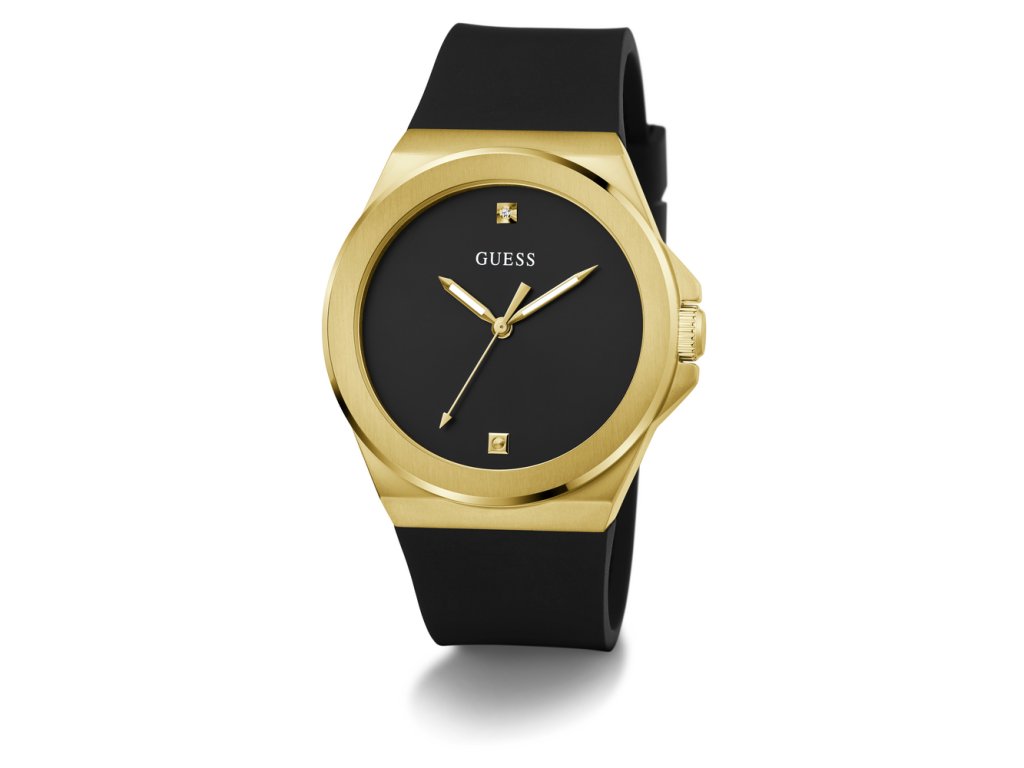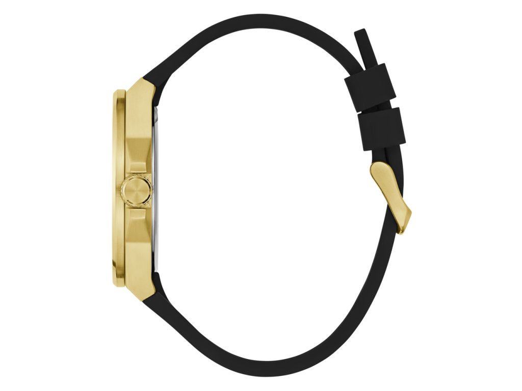 Pánske hodinky GUESS Vinyl z nerezovej ocele zlaté s čiernym ciferníkom so silikónovým čiernym remienkom sú dodávané v originálnej krabičke. Lesk Star je autorizovaným predajcom Guess.