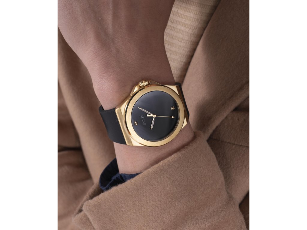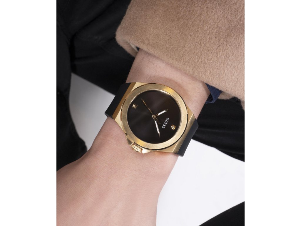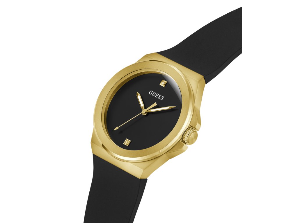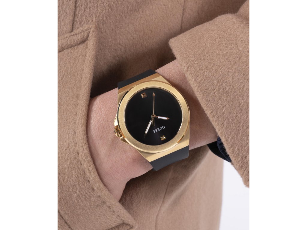Pánske hodinky GUESS Vinyl z nerezovej ocele zlaté s čiernym ciferníkom so silikónovým čiernym remienkom sú dodávané v originálnej krabičke. Lesk Star je autorizovaným predajcom Guess.