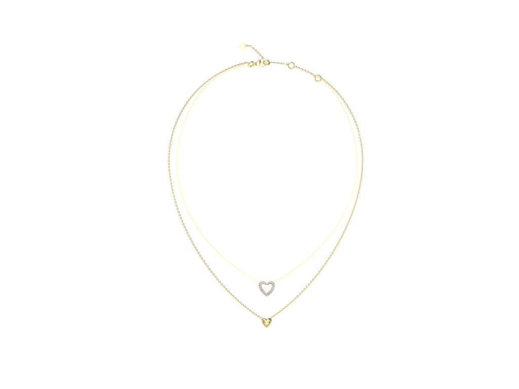Dámsky náhrdelník GUESS Beloved z chirurgickej ocele v zlatej farbe s dvomi príveskami v tvare srdca so zirkónmi a gravírovaním je výrazný, romantický a zároveň elegantný doplnok. Dvojitý retiazkový dizajn pôsobí moderne a štýlovo. Náhrdelník je dodávaný v originálnej krabičke. Lesk Star je autorizovaným predajcom Guess.