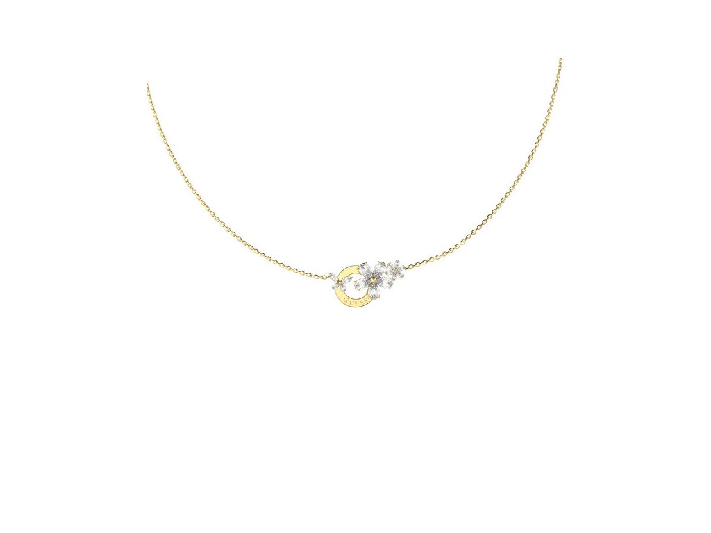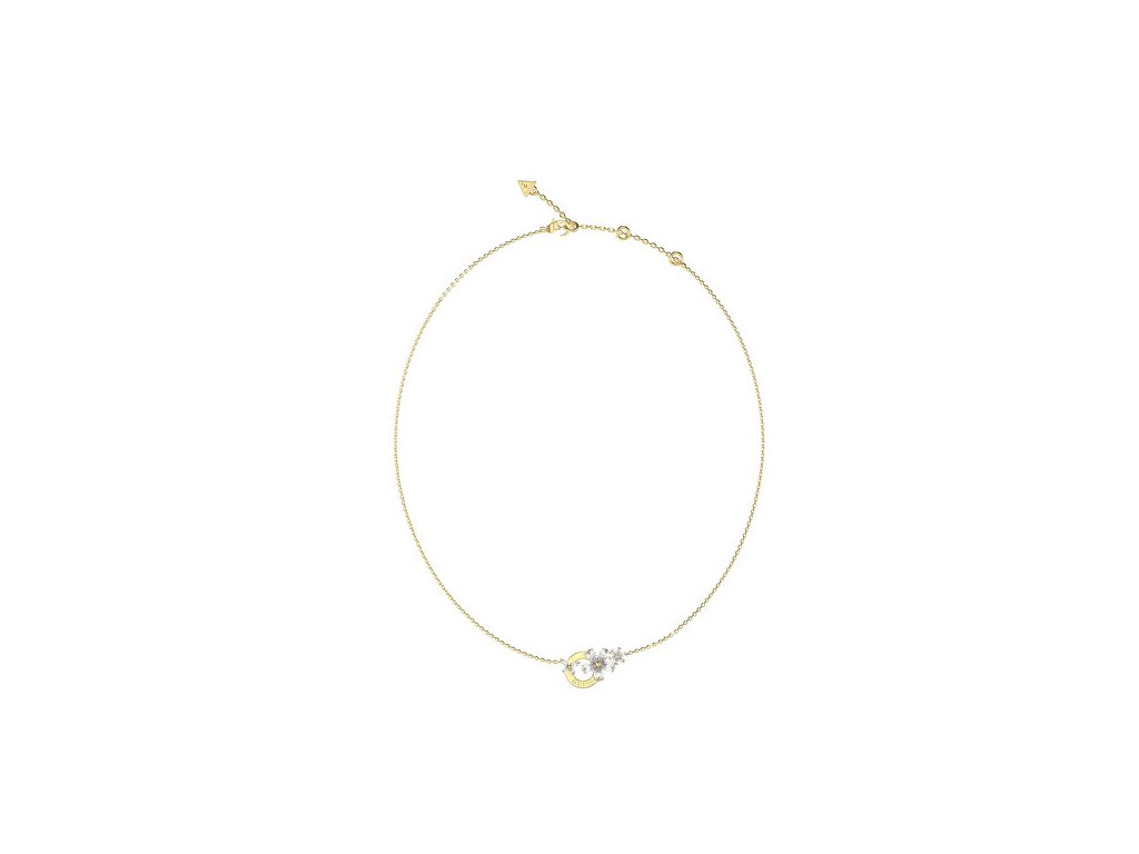 Dámsky náhrdelník GUESS Lily z chirurgickej ocele v zlatej farbe v tvare kruhu so zirkónmi v tvare kvetov je dodávaný v originálnej krabičke. Lesk Star je autorizovaným predajcom Guess.