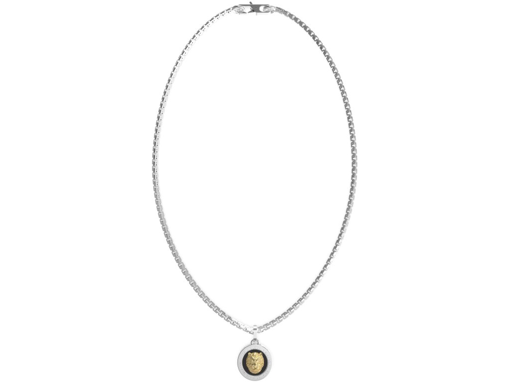 Pánsky náhrdelník GUESS Lion King z chirurgickej ocele s príveskom hlavy leva v zlatej farbe a čierno striebornou obrubou je dodávaný v originálnej krabičke. Lesk Star je autorizovaným predajcom Guess.