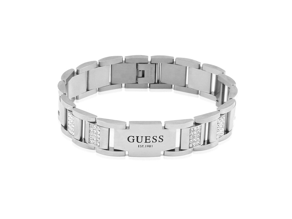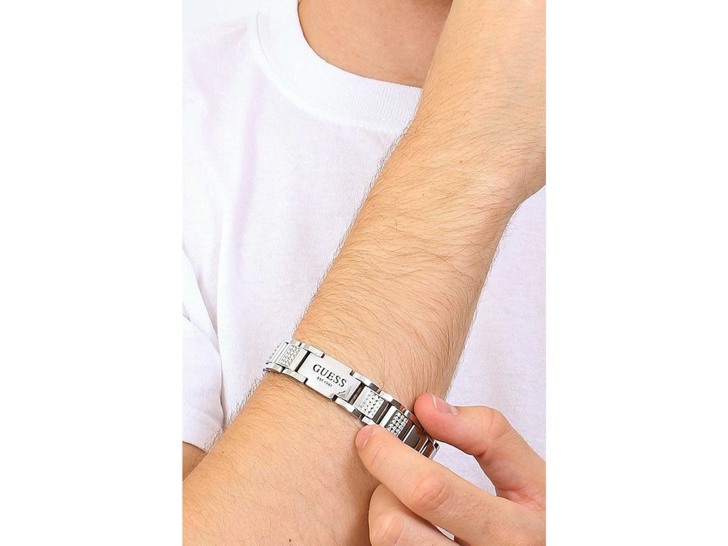 Pánsky náramok GUESS Frontiers z chirurgickej ocele s gravírovaným logom a dekorovaný drobnými čírymi kryštálmi je dodávaný v originálnej krabičke. Lesk Star je autorizovaným predajcom Guess.