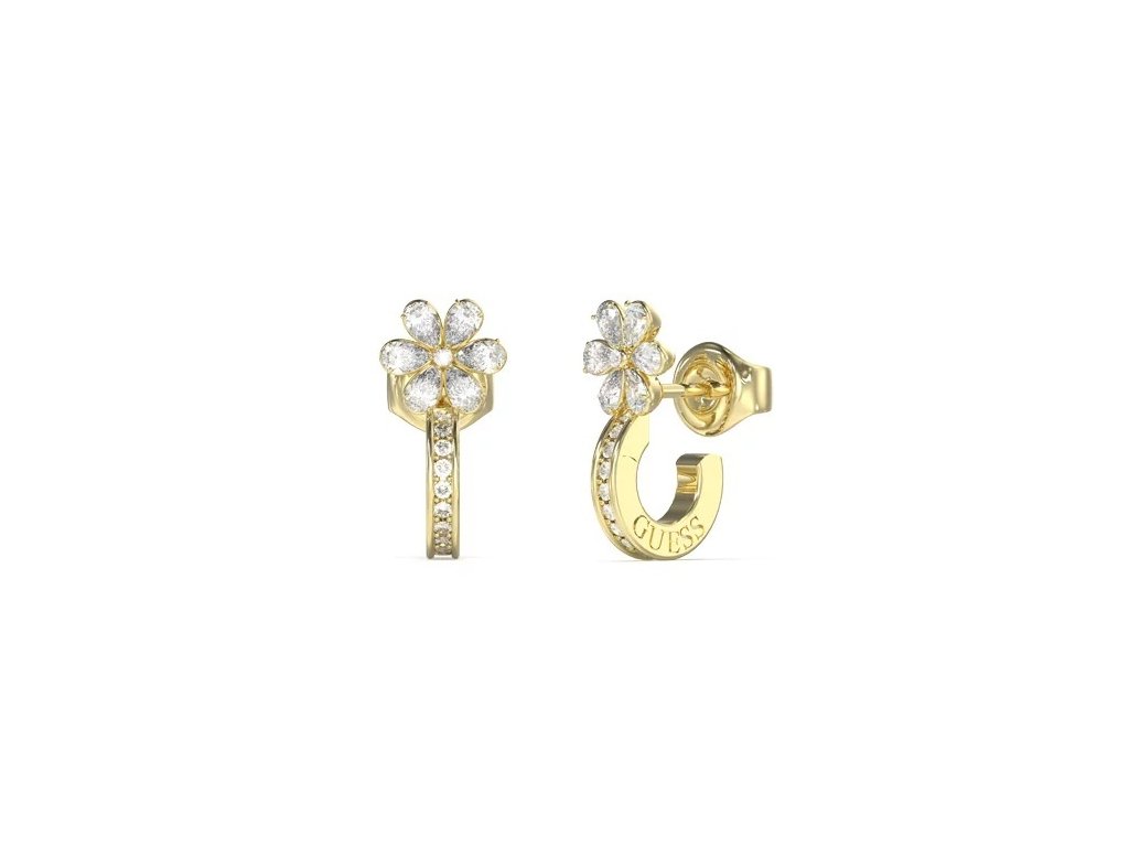 Dámske náušnice GUESS Lily z chirurgickej ocele v tvare polkruhu v zlatej farbe so zirkónmi v tvare kvetov sú dodávané v originálnej krabičke. Lesk Star je autorizovaným predajcom Guess.