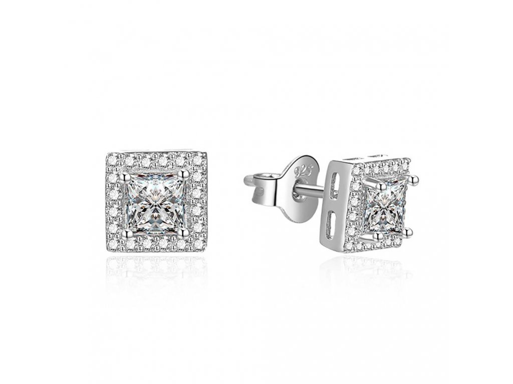 Dámske strieborné náušnice v tvare štvorca s veľkým čírym zirkónom a malými čírymi zirkónmi zo striebra sú dodávané v darčekovej krabičke.