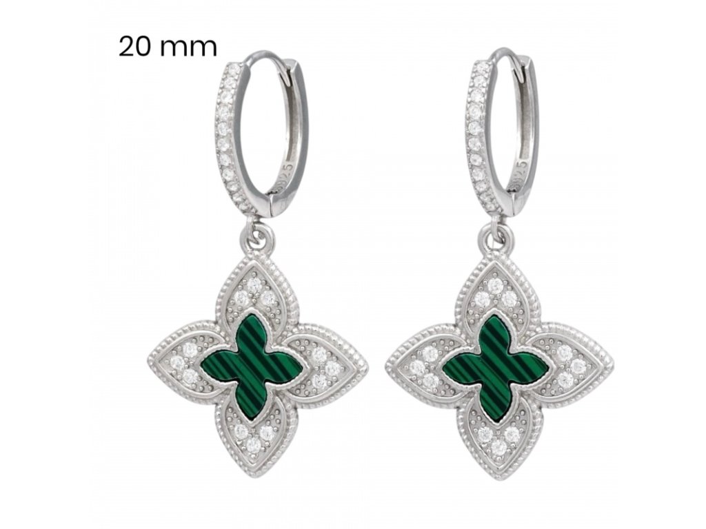 Strieborné visiace náušnice so zelenou kvetinkou a čírymi zirkónmi 40152303
