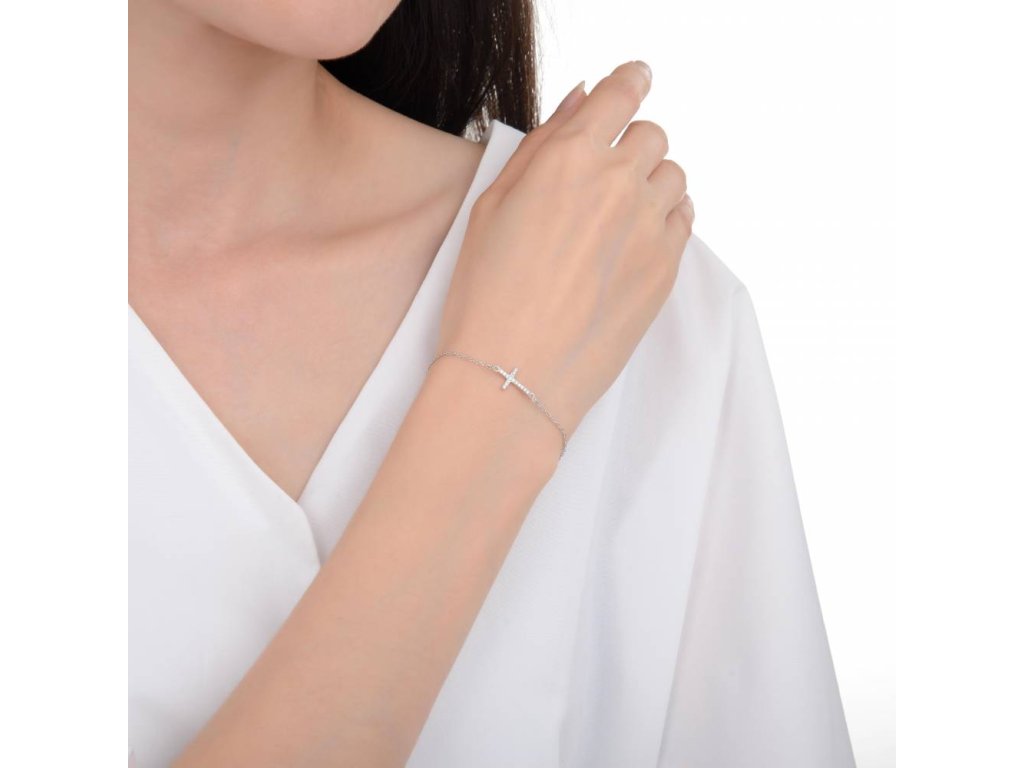 Dámsky strieborný náramok s krížikom zdobeným čírymi zirkónmi je dodávaný v darčekovej krabičke.