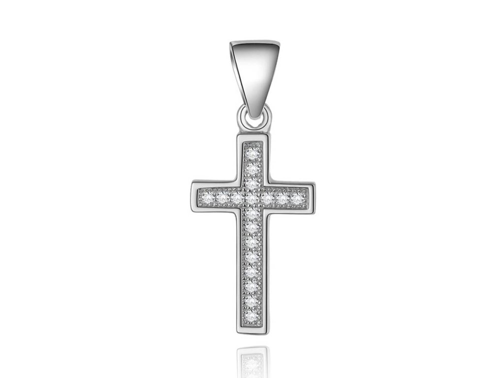 Dámsky strieborný prívesok krížik zdobený čírymi zirkónmi zo striebra je dodávaný v darčekovej krabičke.