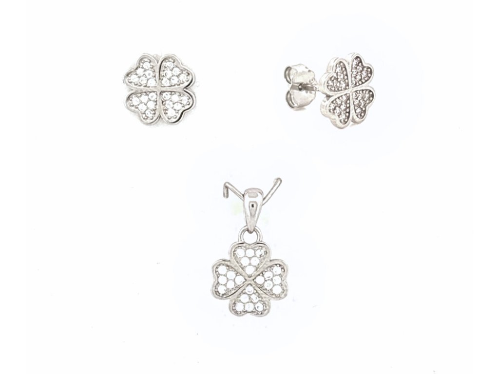 Strieborný set náušnice s príveskom štvorlístok s čírymi zirkónmi S006