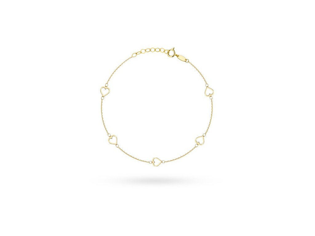 Dámsky zlatý náramok s obrysom sŕdc vyrobený zo 14-karátového zlata je dodávaný v darčekovej krabičke. Šperk spĺňa všetky zákonné požiadavky a v závislosti od hmotnosti je opuncovaný alebo predávaný v súlade s platnými predpismi.